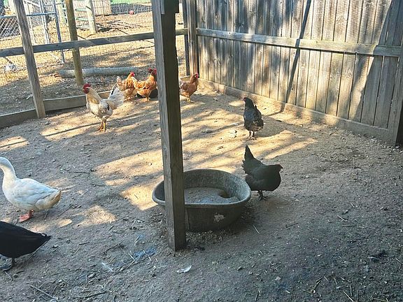 Heated pole barn features a storage room and office as well as an indoor/outdoor chicken coop. (2) 275 gallen freshwater totes for livestock. (2) 120k BTU LP heaters.