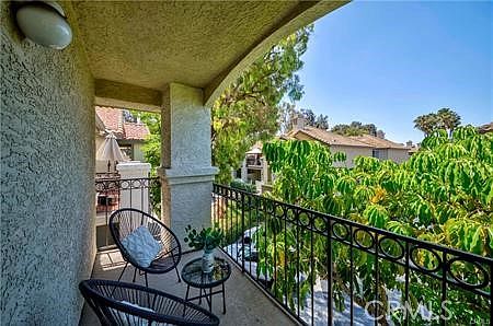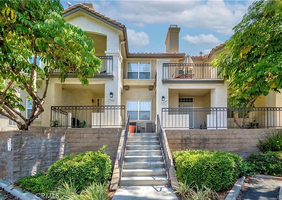 Located in the gated La Mirada Town Center Townhomes, this pristine end-unit offers comfort, privacy, and style no one above or below and only one shared wall. This exceptional tri-level home features 3 spacious bedrooms and 2.5 bathrooms, filled with natural light from numerous dual-pane windows. The inviting front porch welcomes you into an open and airy floor plan highlighted by a cozy tile fireplace, recessed lighting, and newer waterproof laminate flooring on the main level with tile at the entry and carpet upstairs. The remodeled kitchen showcases Quartz countertops and backsplash, upgraded gray cabinetry, stainless/black appliances, tray ceilings, and a bright breakfast nook. A convenient half bath and indoor laundry area are also located downstairs. Upstairs, the elegant primary suite offers dual sinks, a large walk-in closet, and French doors leading to a private balcony with peaceful, tree-lined views perfect for morning coffee or evening relaxation. Additional upgrades include newer HVAC, water heater, light fixtures, toilets, and mirrored closet doors. Direct access to a two-car garage, along with guest parking and nearby street parking, add everyday convenience.