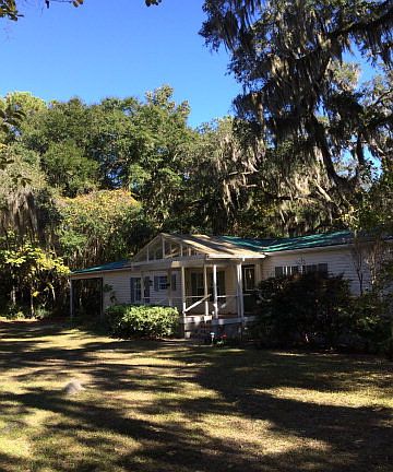 Lovely large mobile home on permanent foundation with carport, covered front porch, & rear deck with gorgeous eastern views over the marsh. Beautiful moss draped oaks & mature landscaping. Step into a spacious great room with fireplace, dining area overlooking front yard bordered by flowering shrubs & greenery, open to spacious light-filled kitchen and breakfast area. This gracious home features a split bed roomplan with the two secondary bedrooms & a bath off a hallway from the kitchen. The master suite off the living room consists of a huge bedroom/sitting room/office, his & her full baths & two walk-in closets.The laundry room is off the kitchen with loads of storage & the back door leading to the carport. French doors from the great room open onto the huge rear deck.