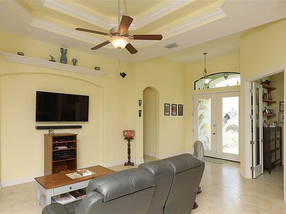 Great Gulf Access on this waterfront beauty! This home welcomes you to join that Florida lifestyle you're craving! Light and bright is the best way to describe this open floor plan. The great room is well appointed with a lit double tray ceiling, surround sound and zero degree sliding glass doors that double your living space by bringing the outdoors in! Den offers volume ceiling and built in desk. Kitchen and dining room flow together making it easy for entertaining. Kitchen features wood cabinetry with crown molding, roll out drawers, under-mount lighting, an oversized granite breakfast bar, stainless appliances and TONS of storage. The master suite is spacious with lanai access through sliding glass doors and 2 large walk in closets. Master bath offers dual vanities, walk through shower, and a rainhead. The guest bedrooms are on opposite side of home and have a pocket door that can be closed off for privacy. Moving out to the lanai, it only gets better! Relax and enjoy surround sound-whether your sunbathing or in the heated saltwater pool! Outdoor kitchen is complete with vented grill, fridge and sink. Practical features include impact glass, paver drive and walk way, landscape curbing, sprinkler system. and front entry screen and electric screen on garage door. Concrete seawall and 8x12 dock that has water and electric. We invite you to scroll through the pictures and view the video attached.