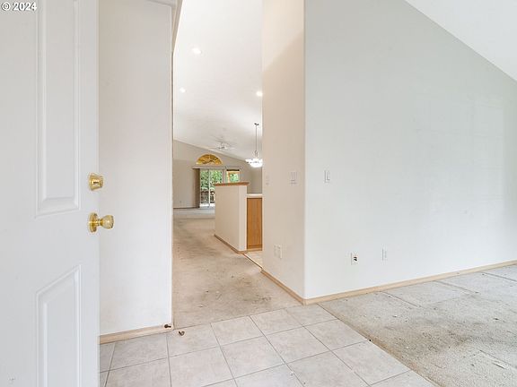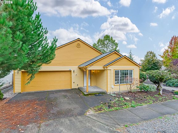 Bright and spacious single-level home featuring an expansive open floor plan and soaring vaulted ceilings, from the formal living room to the large, open great room. Skylights in the huge main living area drench the room in sunlight. The cheery kitchen offers lots of counter space and an island with breakfast bar. All appliances, including washer and dryer, stay with the house. Three bedrooms all on one floor, including the large primary with spacious en-suite bathroom, walk-in closet, and more vaulted ceilings. With a little love and fresh paint this place will sparkle. Stay organized thanks to ample storage in the generous closets and the attached oversized garage. Fantastic covered deck off the great room. Throw a heater out there and enjoy year-round lounge and entertaining space. The lot also borders a charming neighborhood common area that feels like a mini park with flowers, trees, and benches to enjoy the view. Enjoy proximity to Clackamas and Happy Valley dining, shopping, parks, and highly-rated schools.