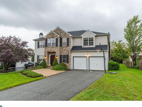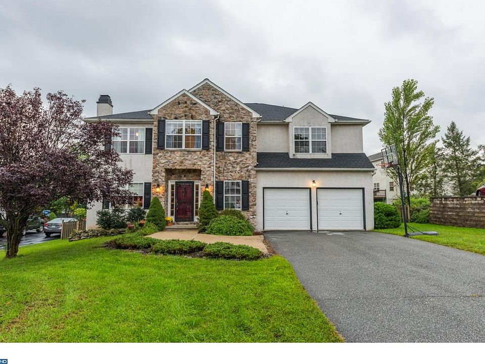 This stately colonial in sought-after Maugers Mill Estates features a breezy layout, four bedrooms, and a bonus multi-purpose room on the first floor. Enter the foyer to find a cozy formal living room with built-in shelving and a wood-burning fireplace. Elegant glass doors lead to the dining room. The spacious eat-in kitchen offers plentiful cabinetry, a full pantry, and a bar-height island. The two-story family room is the centerpiece of the home! The morning sun fills this room with wonderful light, and the gas fireplace makes for cozy evenings. Off the family room, one of the garage bays has been converted to multi-purpose room: use it as an easy-to-hide-all-the-toys playroom, an office, a workshop, or (its current iteration) an organized storage room for games and sporting equipment. Alternatively, the room could be converted back to garage space if so desired. From the family room, you'll find the back staircase leading to four ample-sized bedrooms. The master bedroom features a giant bathroom with a walk-in closet - intuitively designed for early-risers to quietly get ready in the morning. Three additional bedrooms and a hall bath with divided shower room completes the second floor. The level backyard features a large patio and is entirely fenced-in. The garage has one bay for parking, with additional storage or workshop space. An unfinished basement provides even more storage. This home has been well maintained, with a new hot water heater installed in 2018, air conditioning system replaced in 2016, and roof replaced in 2013. The quiet Maugers Mill Estates subdivision is situated only minutes from Route 100, the upscale shops at Upland Square, and Pottsgrove High School. The Fox Hills Trailhead across the street permits walking access from the neighborhood to Hollenbach Park and into the borough. Come see this lovely home today!