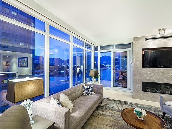 Callisto on the waterfront in Coal Harbour by esteemed Delta Group. This stunning corner suite boasts panoramic NW, W and SW city/water/mountain views from main living areas. The bright den is set up as an ideal home office. The primary bedroom opens on to the balcony and includes a spa-inspired ensuite bath. This home features AC, wide plank engineered hardwood, new gas fireplace, stone/wood accented open gourmet kitchen and quality wool carpets in bedrooms. World class amenities include indoor pool, steam room, view hot tub, fitness centre, theatre, event rooms, 24 hr concierge, 2 parking stalls with private EV charger and storage locker. All just steps to the community centre, seawall, bike lanes, Stanley Park, shopping, restaurants, marina, new Coal Harbour school + child care centre.