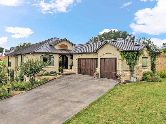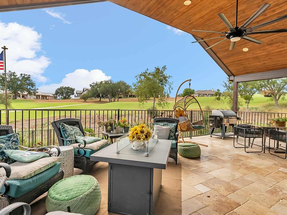 Nestled in a quiet cul-de-sac and overlooking the 7th hole of the renowned Ram Rock Golf Course, this custom-built 3 bedroom, 3.5 bath home with office and media room offers luxury, efficiency, and breathtaking Hill Country views. Step through the custom wrought-iron double front doors into an inviting interior featuring antique Bari chiseled travertine tile throughout with plush carpet in bedrooms, 8-foot doors, and abundant natural light. The main living area showcases an electric stone-faced fireplace and flows seamlessly to the expansive deck and patio areas - nearly 1,000 sq. ft. of outdoor patio living space with cedar tongue-and-groove ceilings and an outdoor kitchen that is designed for entertaining, with granite countertops, gas grill, sink, and refrigerator. The chef’s kitchen is outfitted with Samsung stainless appliances, elegant granite counters with a marble mosaic backsplash, and an oversized pantry with exceptional storage. The primary suite, located on the main floor, boasts a spectacular view of the golf course and a spa-like bath with a 60" standalone soaking tub and huge walk-in shower. Each additional bedroom includes a frameless glass shower and custom finishes. Downstairs, enjoy a second common area with a stone fireplace and bar, media room, two guest rooms and bonus laundry setup, perfect for guests. This home blends modern efficiency with timeless design, offering expansive views, thoughtful details, and resort-style outdoor living.