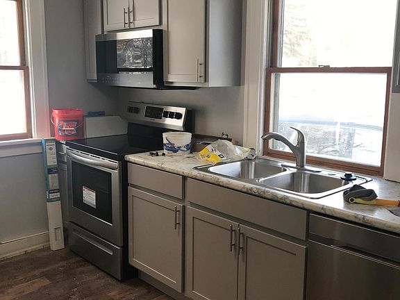 Almost complete. Main level totally remodeled. Brand new grey kitchen! Stainless steel appliances. Brand new bathroom with tiled shower. All freshly painted grey and white trim. Refinished hardwood. 2 bedrooms on main and 1 upstairs Basement for storage 1 car detached garage Tenant pays all utilities and is responsible for lawn and snow