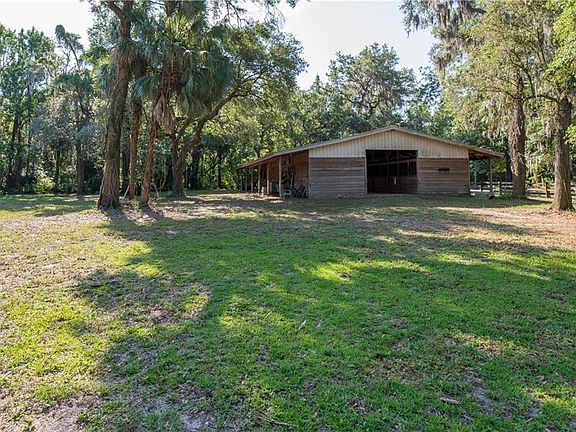 Serene and Secluded Private Homesite with many improvements. This private retreat features a winding road that leads you through beautiful, natural Florida habitat and undisturbed creek to the secluded homesite and barn at the rear of the property. The house is 672 square feet with 1 bedroom and 1 bathroom. The barn offers 9 stalls, a tack room with AC and restroom, 6' overhang on the exterior of each stall and 4 paddocks. In addition to the barn there is a carport with an air-conditioned office and an equipment shed. Being bordered by conservation land to the north, this property boasts a completely secluded homesite, with a natural buffer left intact along the perimeter. Many improvements to the property to save you extra time and money, like power and water accessible at the gate and entirely fenced in field fencing.