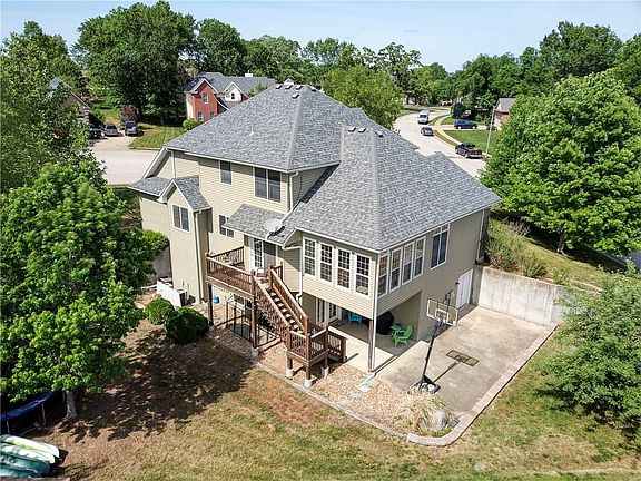 Stately 5 bedroom, 3.5 bath Lake Ridge home with room for everyone at 4393 sq ft! Main level highlights include a huge formal living/family room, formal dining room, master suite, hardwood floors, and a lovely sunroom with walls of windows. Upper level offers 2 large bedrooms with bathroom. Finished, walk-out basement level also has 2 large bedrooms (with tall ceilings!) and a full bathroom, huge family room with fireplace, ample storage, and a bonus garden garage perfect for a mower, bikes, kids' sporting equipment, snow gear - endless possibilities! Home sits on a large corner lot (.5 acre!) with driveway in a quiet cul-de-sac. Deep 2 car garage so you can fit larger vehicles! There are many different uses for the outdoor space - and there is already a spacious sport court for playing basketball or any other activity! Whole house water softener and filter, new water heater, and newer roof and gutters make this home the complete package. Lake Ridge is a mature, established neighborhood offering a pond, lake, wooded area/creek, and a walk/bike path at the entrance! 13 minutes to Whiteman AFB.