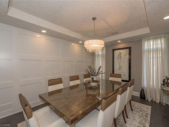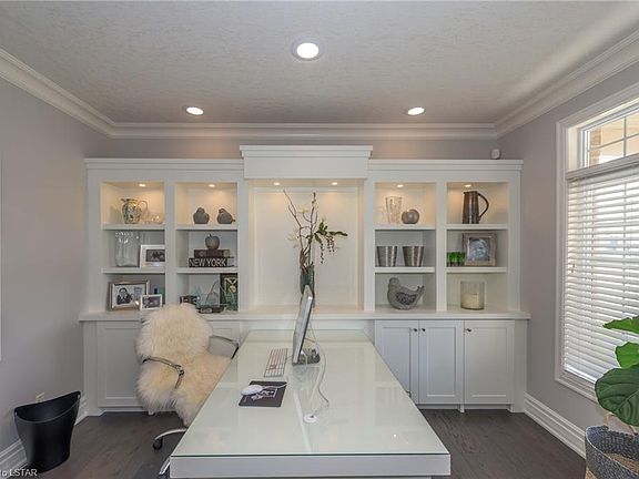 Executive 5-bedroom home in West London's Riverbend neighbourhood. Fantastic, family-friendly location w/ parks, trails, ponds, school & playground. From the covered front porch to the fully-fenced, pool-sized back yard w/ stamped concrete patio, lush mature tree - this sunny corner lot offers beautiful outdoor living. Step inside and the details will capture your attention. Rich hardwood floors. Crown moulding. Transom windows. Gorgeous private office w/ designer built-ins including desk. Large eat-in kitchen w/soft white cabinetry, stainless appliances & centre island all perfectly positioned between the formal Dining room w/ feature wall & an inviting family room w/ loads of windows & a stone-surround fireplace. 2nd floor enjoys 4 bedrooms including a spacious, romantic master suite w/ tray ceiling, hardwood floors, upgraded 5-piece ensuite & walk in closet. Fabulous 2nd floor laundry with built-ins. Integrated audio/speakers throughout. Lower level adds a large family room w/ gas fireplace, 4 piece washroom, guest room, games area & loads of storage. Welcome home.