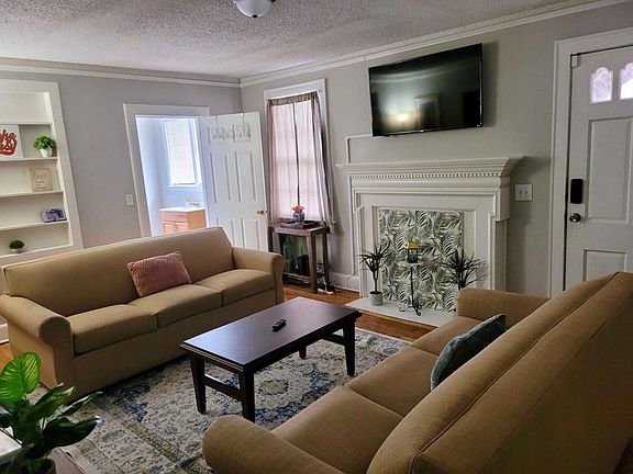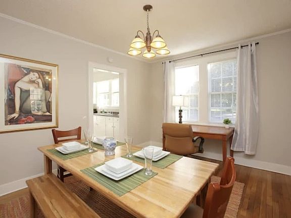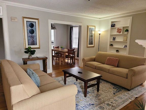 Welcome to this charming 3-bedroom, 2-bath brick cottage just minutes north of downtown Columbia. Feel at home with a fenced yard, WiFi, and a fully stocked kitchenperfect for both work and leisure trips. Whether visiting family at Fort Jackson, attending a USC game, or spending time with friends, this home is ready to host you for a few days or a few months. The backyard features a grill and a 50" TV with Roku. This beautifully preserved cottage features an inviting living room with two pullout sofas and two accent chairs, perfect for socializing or catching up on Netflix with the 50" Roku TV over the fireplace mantle. The living room opens into the dining room with a special farm table, crafted by a Christian rehabilitation center. A desk and chair in the corner provide a great work station. The fully appointed kitchen includes a refrigerator/freezer, stove/oven, microwave, and a traditional drip coffee maker. The kitchen leads to the laundry room and back porch, equipped with a stackable washer and dryer. The bedrooms are organized around a central common space: Bedroom 1 has a King bed, Bedroom 2 has two Full beds, and Bedroom 3 has a Queen bed, each with a closet and blackout curtains. Two bathrooms feature a tub/shower combo, toilet, sink, and mirror with drying hooks. Pet friendly with a fee. A pack 'n play/travel crib is available upon request. Located just minutes from downtown, this home is close to Lorick Park and 9 minutes from USC. While some guests have expressed concerns about the neighborhood, the area has never had any security issues. For those concerned, a discussion and refund option within 24 hours of booking is available. The residential area is best navigated by car, but Uber and Lyft are also available. Guests will receive their door code twenty-four hours prior to check-in and will have full and private access to the home and yard with no shared spaces. Contact-free check-in is offered, with support available via phone call if needed. There is a train in the vicinity, so some train noise is expected. Pets must be crated when left unattended, are not allowed on furniture or beds, and all waste must be cleaned up. A non-refundable pet fee applies, and additional cleaning costs may be charged if pet hair or waste is found. Smoking and parties are not mentioned, so assume standard policies apply. Includes a desk and chair for a convenient work station.