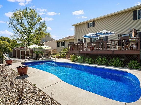 Outdoor living & entertaining at its finest! This fully fenced backyard oasis boasts a 14' x 34' heated fiberglass pool with a 20' x 30' concrete patio (2016), & a huge 15' x 22' deck. Inside you will find updates galore starting in the kitchen with granite, farm sink with professional grade faucet & garbage disposal, custom backsplash & reverse osmosis drinking water system. Newer flooring & fresh paint throughout. The main floor has a 5th bedroom/office, updated half bath, formal dining & living rooms, & family room with gas fireplace. Upstairs are 4 generously sized bedrooms & 2 updated baths with new plumbing. New sump pump (2021), new windows & AC (2018), new furnace & humidifier (2015), 10' x 12' garden/pool shed (2015), potting shed/chicken coop (2016). Full basement too!