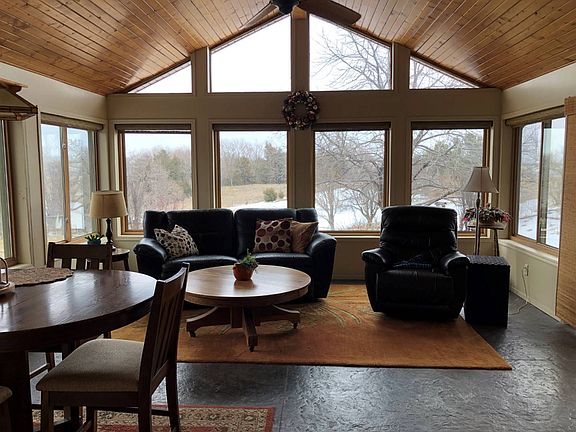 This beautiful 2-bedroom home comes with a stunning view of 11.5 acres bordered by rolling wooded areas. The open concept is featured in the kitchen, dining and living rooms and in the large sunroom. The stamped concrete patio and pergola with shadesails, 32x64 Cleary building with concrete floor and another 20x40 metal building compliment the beautifully landscaped yard with underground sprinkler system.