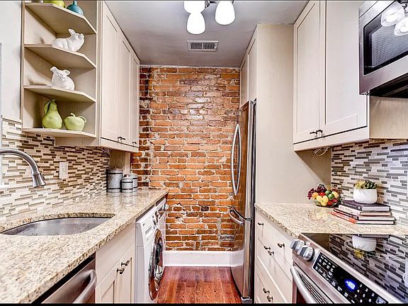Live in the heart of DC in this beautifully designed 1-bedroom apartment located between Logan Circle and Dupont Circle. This light-filled unit boasts a working fireplace, gorgeous bay windows that flood the living space with natural light, and exposed brick in both the kitchen and bedroom. The wall of windows in the bedroom ensures that the back of the apartments is also sun-filled. The apartment has an in-unit washer and dryer, brand new refrigerator, plus stylish built-ins and hardwood floors throughout. You're just one block from Whole Foods, the best dining and shopping on 14th St NW, and a variety of gyms and fitness studios.