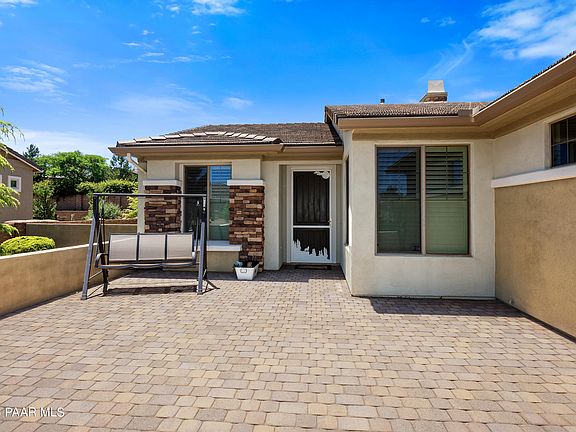 Located in the highly desirable gated community of Brookside in Prescott Lakes, this home is just a short walk away from the fabulous Prescott Lakes Clubhouse and the many amenities it has to offer. Upon entering the single-level home you will be greeted by the great room, open kitchen and dining areas. The great room features newly expanded oversized glass doors leading to the back patio, raised height 12' ceilings, wood floors and a cozy gas fireplace. The kitchen is a chef's dream, showcasing expansive granite counters, tile backsplash, an island, newer stainless steel appliances, and a large pantry. The adjoining dining area and kitchen bar provide ample room to enjoy a lovely meal with your friends and family. The spacious owner's suite is a true retreat, offering a spa-like bathroom