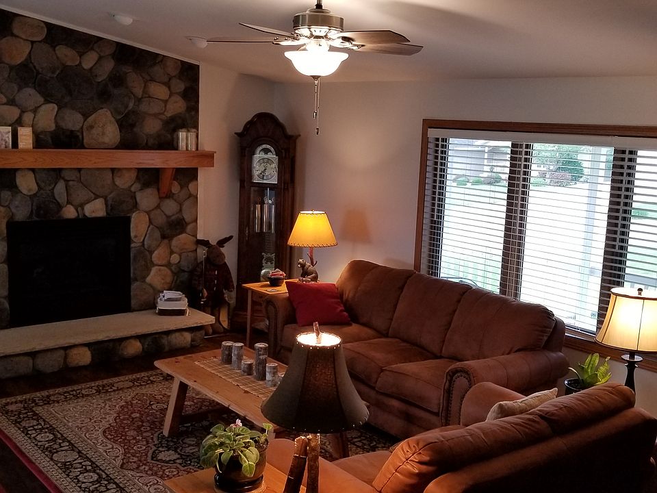 Move in ready Ranch home offering over 3,200 finished square feet in great location overlooking East Lake Park and walk/bike path. Main floor offers vaulted ceilings in living room, dining room, and family room, and offering open floor plan. Nice sized kitchen with bar and stainless steel appliances staying. Master bedroom with full bathroom on suite, additional 2 bedrooms, full bath, laundry and mud room. Lower level family room with bar and gas fireplace, 2 additional legal bedrooms, full bath and endless storage. Many updates including: new flooring throughout, all freshly painted, some lighting fixtures and more. Very well kept and quality built home make this a MUST SEE!