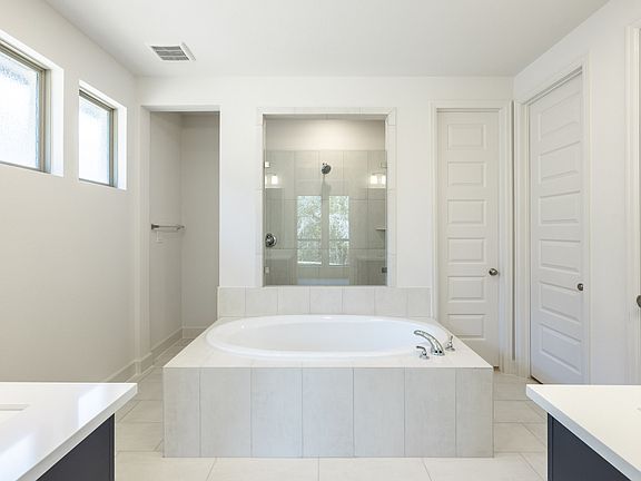 Home office with French doors set at two-story entry. Open kitchen offers deep walk-in pantry, 5-burner gas cooktop and generous island with built-in seating space. Dining area opens to two-story family room with wall of windows. Primary suite with 10-foot ceiling. Dual vanities, garden tub, separate glass-enclosed shower and large walk-in closet in primary bath. A second bedroom is downstairs. A game room and secondary bedrooms are upstairs. Covered backyard patio. Mud room off two-car garage. Representative Images. Features and specifications may vary by community.