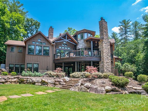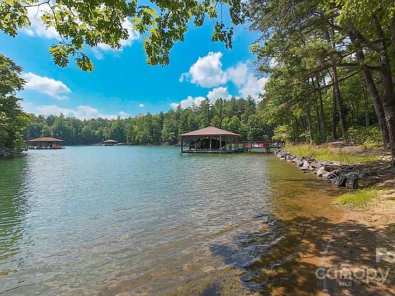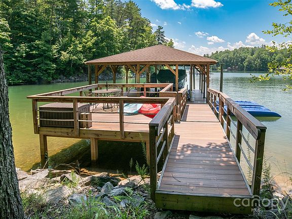 Custom built home on Lake James in the desirable community of 1780! Once you enter the landscaped circular driveway you will be in awe! This rustic home includes a covered boat dock w/ Hydro-Hoist boat lift, floating docks for jet skis, automatic outdoor lighting down to the dock and firepit for cozy nights. Gorgeous entryway with vaulted ceiling, wood beams and stone columns. Everything you need is on the main level inc. the guest house. Executive office, formal dining room and two living areas for endless entertaining. High-end chef kitchen featuring a Wolf 6 burner gas top stove, custom hood vent, decorative copper sinks and live edge granite. Primary bedroom ensuite w/ custom walk-in closet, soaking tub and dual side entry shower. Upper level offers plenty of room for family or friends. Lower level features a temperature controlled wine cellar, family room, game room and 2 bedrooms each with their own private bathroom. Half Bath and outdoor shower on lower patio. CLJ membership inc
