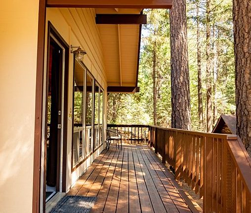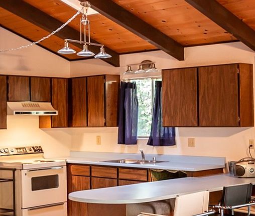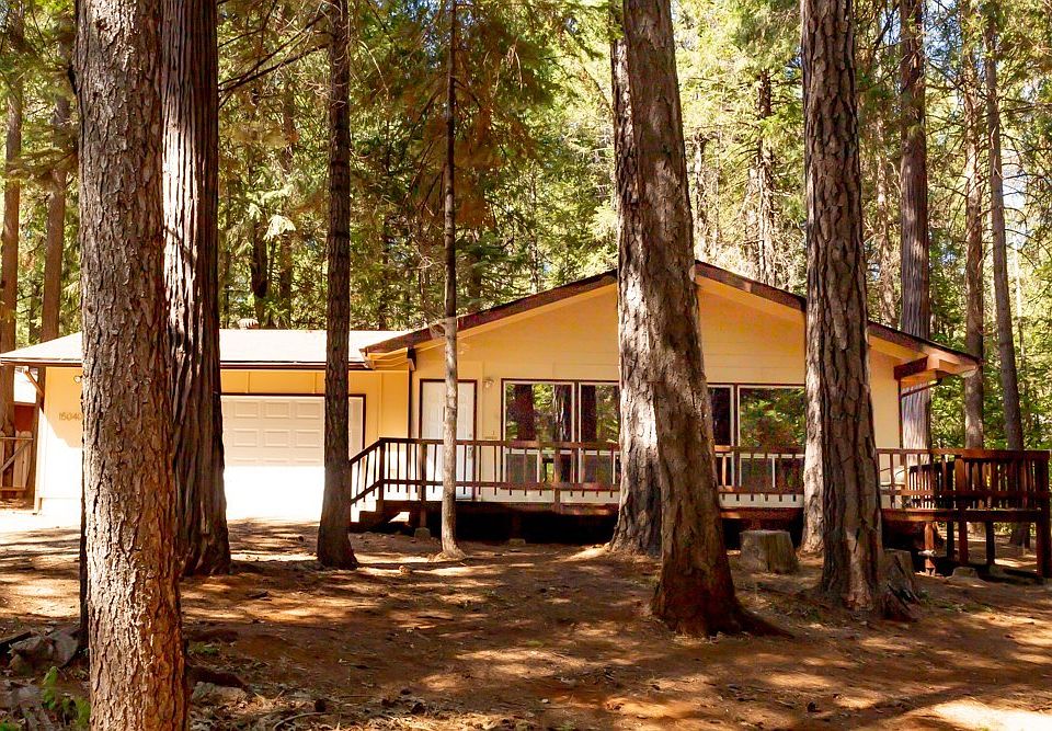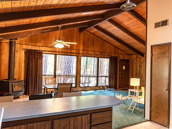 A TERRIFIC Value in The Pines! Two bedroom, two bath home with open floor plan and lots of windows. Love those wood ceilings! Large lot with privacy. Home features two skylights (kitchen and living room), two ceiling fans, double garage with new door, garage door opener, Natural light provided in garage by both a window and a slider. Great room with a large kitchen ideal for entertaining with a cozy wood stove for those cool winter evenings. Built-in seat and double shower head in walk-in shower in master bath, also has new vinyl window, vanity, and faucet. Main bath also has double shower head, tile on vanity. Includes appliances: washer, dryer, stove. Newer deck, constructed of pressure treated lumber, freshly painted with high quality Behr paint. New exterior paint. Even though it's on the right side of Skyway, it does include Paradise Pines HOA membership. Defensible space already created to meet fire code by PG&E, walk to elementary school. Don't miss the cute, quaint log cabin, could be used for storage, craft shop?