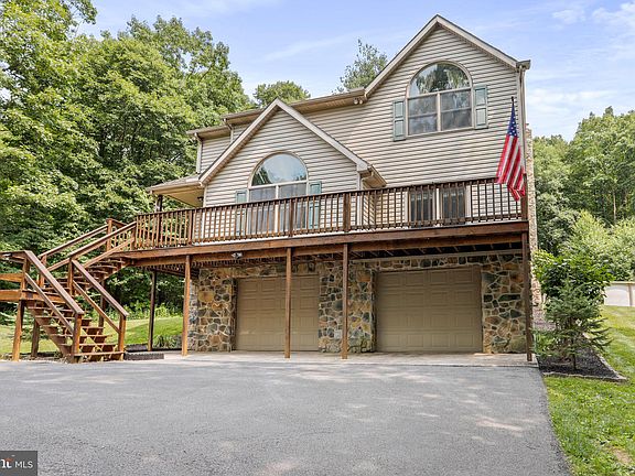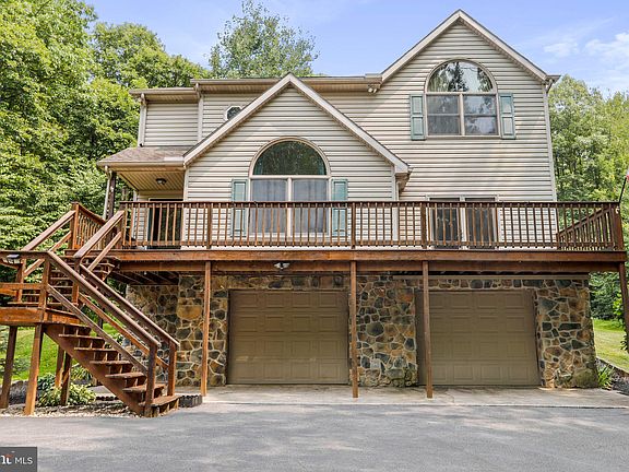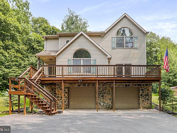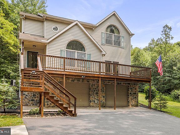 Profession Photos coming soon. MOUNTAIN LIVING AT ITS FINEST! This meticulously maintained, custom built 4BR/2.5 bath/4 CAR GARAGE home sits on a beautiful 1.88 acre wooded lot and ready for its next owner! The paved driveway leads to an oversized 28x30 detached 2 car garage featuring a fully finished loft area. The private backyard houses a Trex deck heading into an above ground pool. Enjoy your fall evenings watching the leaves change color while unwinding on the huge front deck. Upon entry, you are greeted with a stunning stone accent wall in the spacious family/dining room showcasing an electric fireplace, custom windows, and Brazilian Teak flooring throughout. The eat in kitchen boasts an abundance of custom cabinetry, a breakfast bar, tile flooring and some updated appliances. This leads to an office with built-in desks and walnut shelving. Upstairs you have 4 bedrooms highlighted by the master suite with his and her closets and master bath featuring a oversized jetted tub and walk-in shower. With dual zoned central AC/heat pumps your utilities will be very affordable, but you also have a Quadra-Fire wood stove that will keep the entire house warm during those chilly winter months.