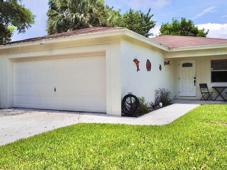 Secluded private No Mandatory HOA home with 2 car garage stylized with a Florida Keys pulse featuring beautifully landscaped rear yard with artificial turf and 6-person hot tub backing to a canal with no rear neighbors. 2002 CBS concrete construction with hurricane protection. Stainless Steel appliances New AC in 2021; hot water heater 2018. Home is located in quiet corner of Country Club Acres so no drive thru traffic. Beach is just 5 miles away. Shopping, restaurants and groceries are just around the corner. Just minutes to the Florida Turnpike and I-95.New roof is in the process of being installed for the benefit of a new owner.