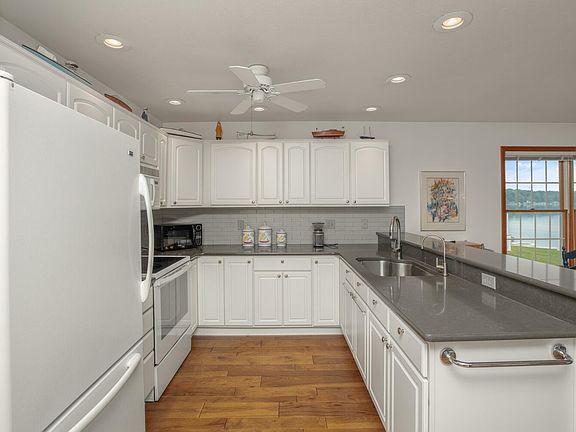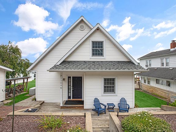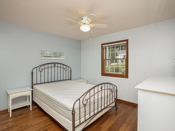 This cozy two-story, three-bedroom, two-and-a-half-bath, 1,476-square-foot home on the south side of relaxed, spring-fed, all-sports Birch Lake has a sandy beach, excellent swimming and rafting, a waterside patio of antique street brick pavers, a private dock and sunning platform, a seawall, a dock, a sunning platform, and spectacular nature views. Inside, the main level has a living/dining area with panoramic views, a woodburning stove, and access to a deck and to a carpeted, insulated sunroom with screens and retractable windows; a kitchen with a peninsula with bar seating, subway tile backsplash, and quartz counters; a primary bedroom with bath with dual vanities; and a half-bath with laundry. Upstairs are two bedrooms and a bath with skylights. The house has newer wood floors and a generator. The property includes a two-car detached garage and off-street parking on a backlot, a streetside wraparound deck and storage shed.