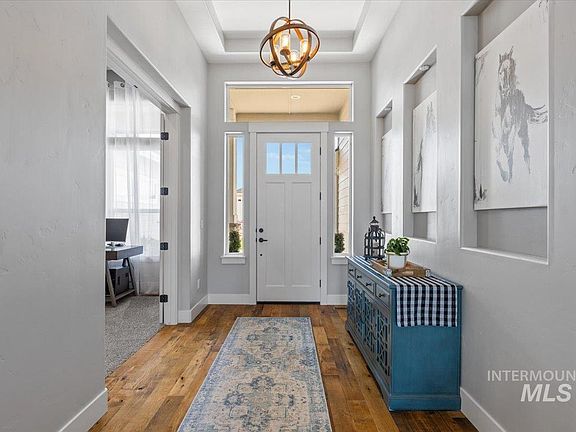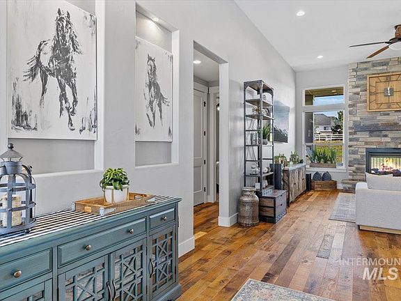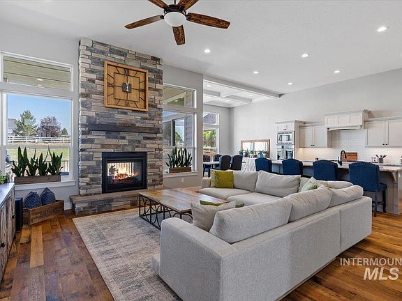 This home is an ideal fusion of coziness and charm! Its open layout bathes the interior in sunlight through expansive windows, highlighting the generous space and tranquil views. The kitchen stands out as a functional and stylish centerpiece, boasting a sizeable island, granite countertops, and a double oven with a microwave, simplifying the culinary process. Modern fixtures and a distinct dining area create an inviting setting for family gatherings. In the living room, openness and illumination prevail. The dual-sided fireplace extends to the outdoor patio contributing to the home's warm atmosphere. A standout attribute of this home is the North facing backyard, a haven in the summer months with the absence of rear neighbors to ensure privacy. The homes comfort is further enhanced with an upper bonus room with a dedicated full bathroom perfect for any guest. The neighborhood also offers a fully stocked fishing pond and Purple Sage Golf Course across the street.