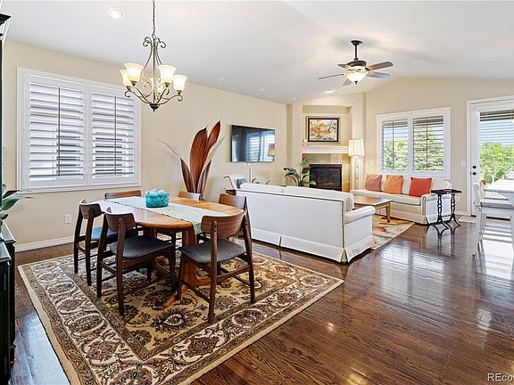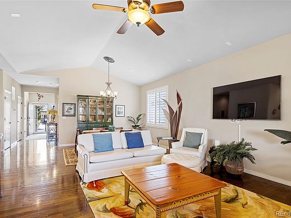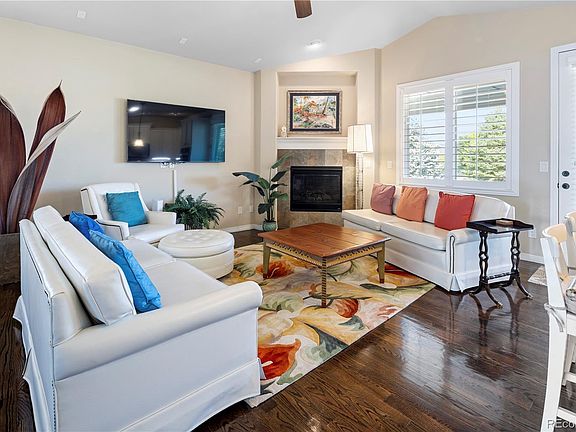 WELCOME home to this immaculate ranch style, 3 bedroom, 2 bath home located in Heritage Todd Creek, a sought-after 55+ golf course community. The open floor plan is ideal for entertaining your family and friends and features a great room with cozy fireplace, dining area, and gourmet kitchen. The kitchen features stunning white cabinets accented by granite countertops and a subway tile backsplash, stainless-steel appliances including cook top, double ovens, microwave oven and refrigerator., and offers a large center island with seating for 4. You can expand your party to the outdoor covered patio with Trex decking, views of the green belt and a beautifully landscaped yard. A large primary suite is a perfect retreat with a luxurious master bath. You will fall in love with the special features throughout including the beautiful hardwood floors, a state-of-the-art Quietcool whole house fan, and the professionally xeriscape landscaping that enhances the low maintenance living of this wonderful home. The large 2 car finished garage with epoxy floor and custom cabinets for plenty of storage, allows room for your golf cart, automobile, and extra toys. A full unfinished basement is ready to customize for your hobbies or grandkids and let your imagination go wild. You’ll have plenty of time to play golf, tennis, and pickle ball, or enjoy social activities and dining at the club house, where you can meet old friends or make new ones.. Heritage Todd Creek is the perfect place to call home.