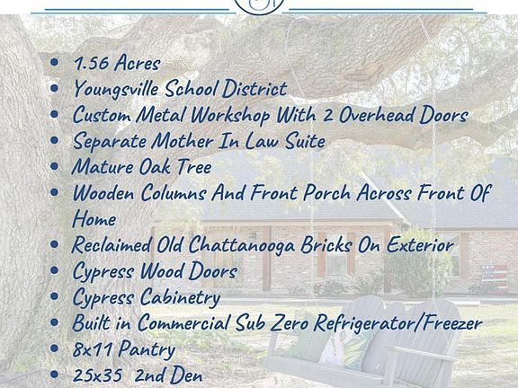 5 year old CUSTOM BUILD on 1.56 acres in Youngsville school district and not in any Flood Zone. Included on the beautiful home site is a custom metal workshop with 2 overhead doors! Driving up you realize you are not far from the center of all there is to do in Youngsville, but yet that country feel! Upon arriving you see a beautiful large lot with a mature oak tree welcoming you home. The home itself has wooden columns and a front porch expanding across entire front of home, ready for you to relax on a long summer day. Exterior bricks are reclaimed Old Chattanooga bricks. Inside you find custom features throughout. All doors, interior and exterior, are made from Cypress wood.