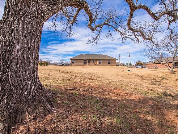 This home sits in a quiet cul-de-sac on a large lot with mature trees. Just 20-25 minutes to OKC. Single owner home, 10 ft ceilings throughout, 2” wood blinds, water softener, gas fireplace, storm cellar. Master bed with walk in closet and dual vanities. Home is on well water and aerobic septic system. Other than the fireplace, home is all electric.