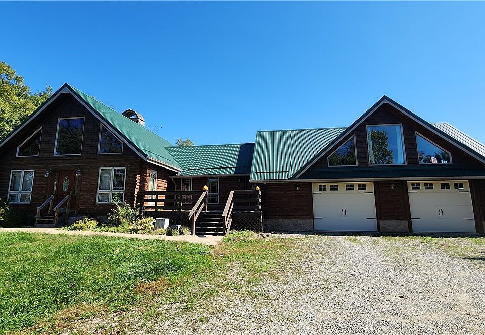 Custom built log home on 11 acres with scenic views. Over 3000 sq ft of living space. Open concept kitchen, dining room, and living room with a deck off of the living room. A beautiful spiral staircase leads to a loft that serves as a 3rd bedroom. The finished walk out basement includes a family/rec room and a 4th bedroom. There is also a huge bonus room with French doors leading to a balcony. The oversized 2 car attached garage is heated and leads to the covered back patio. There is also a detached 47 x 24 detached garage and 28 x 14 shed (formerly a dog kennel) with attached chicken coop. This is a great opportunity to own a gorgeous home.
