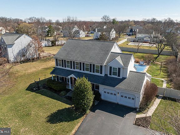 Welcome to 1505 Huntly Drive, a beautiful center-hall colonial with front porch, nestled in the highly sought-after Hidden Pond community within the Central Bucks School District! This exceptional home offers 5 spacious bedrooms, 2.5 bathrooms, and a 2-car attached garage with an expanded driveway. Situated on nearly half an acre, the property features a pristine in-ground pool in the beautifully landscaped backyard. Upon entering, you’ll be greeted by gleaming hardwood floors that flow throughout the first level, beginning in the inviting foyer. To your left, a versatile room with French doors offers the perfect space for a study, office, living room, or playroom. To the right, the elegant dining room boasts crown molding and chair rail, seamlessly connecting to the newly renovated gourmet kitchen. This kitchen is a chef’s dream, featuring custom white KraftMaid cabinetry with soft-close drawers, pull-out spice racks, and ample storage. The beautiful granite countertops, kitchen island, neutral tile backsplash, and stainless steel appliances create a stunning, yet highly functional space. Additional highlights include a coffee bar, pantry, window seat and recessed lighting. The spacious mudroom, located just off the kitchen, includes convenient shelving, a closet, and tile flooring. The door from the mudroom leads to the 2-car attached garage. Adjacent to the kitchen, the cozy family room boasts a gas fireplace, ceiling fan, and easy access to the full unfinished basement and backyard. A stylishly updated powder room with a modern sink and a coat closet complete the first floor. Upstairs, a beautiful hardwood staircase with a new runner leads to the upper level, which features fresh carpeting. The luxurious primary bedroom features vaulted ceilings, a spacious walk-in closet with organizers, and an en-suite bath. The updated primary bathroom is the epitome of luxury, offering heated tile floors, double sinks with quartz countertops, a spacious tile shower with jets, and a whirlpool tub—perfect for relaxation. Gorgeous white wooden shutters complete the serene ambiance. Four additional generously sized bedrooms are located on this level, along with an updated full bathroom featuring a shower/tub combo, newer tile, granite countertops, and more beautiful white shutters. A hall linen closet provides additional storage. The backyard is an entertainer’s dream, featuring a meticulously maintained saltwater in-ground pool (pictures available from the summer), a covered patio with a ceiling fan, a hammock, and a large grassy area beyond the pool. The yard is fully enclosed by a newer PVC privacy fence, ensuring both privacy and tranquility. This home has been lovingly maintained by its original owners and is updated and neutral throughout. Recent updates include a new HVAC system (2014), new, hot water heater (2021), new roof (2013), all new double-hung windows (2020), and fresh interior paint (2024-2025). Playground with ball fields and a pond just 1.5 blocks away. Don’t miss the opportunity to make this meticulously maintained, move-in-ready home yours!