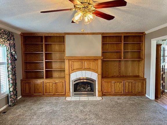 - Features: Built-in Features, Carpet, Ceiling Fan(s), Fireplace