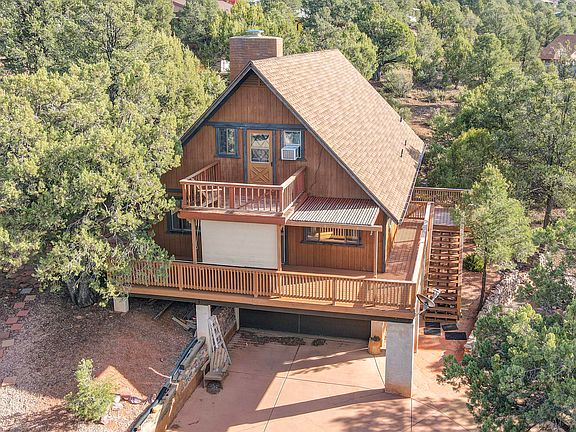 Roomy, 1748sf rustic mountain chalet in Payson. There is room for everyone and views to boot! Main level has wrap around deck to entry, spacious living room with wood stove insert in rock fireplace. Kitchen has eat-in dining. Master Bedroom, walk-in closet and bathroom with tub-shower. Upstairs there are two bedrooms with one having a small deck with views of the Mogollon Rim. Full bathroom as well. Lower level is a two-car garage, workshop-storage, laundry room and a game room with pool table. Home is situated on a 0.22AC lot for privacy. Get ready to call this home!