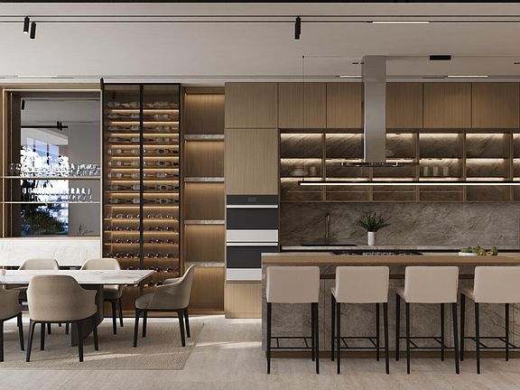 The outdoor living experience is equally exceptional, conceived as a natural extension of the interior. A heated saltwater pool anchors the space, complemented by a covered outdoor kitchen and cabana bath, creating a resort-style setting ideal for year-round South Florida enjoyment. Optional furniture and technology packages further enhance the residence's turnkey appeal.
