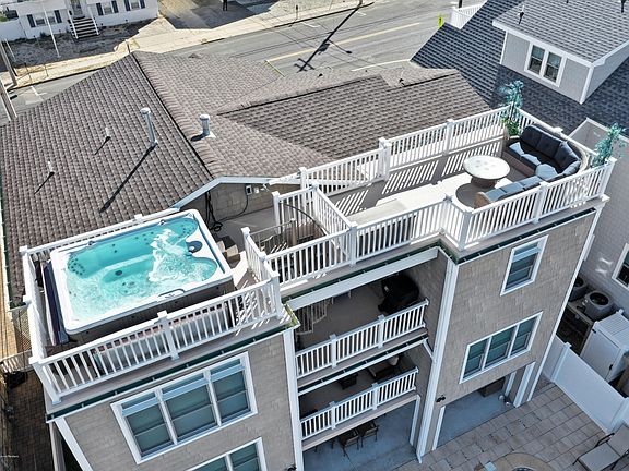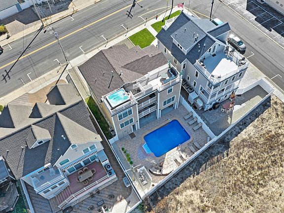 Absolutely gorgeous 5 BR 3.5 bathroom home directly across the street from the beach! When this home was built, just a few short years ago, every detail was taken into account. This reverse living home features a top floor with a master BR suite as well as an open concept kitchen with massive island, enough seating space for 7+, a large bright LR with vaulted ceilings, recessed lighting, built in speakers & windows with ocean & lake views as well as a half bath. The second floor offers a 2nd LR along with a wet bar, 4 large BRs & 2 beautiful full bathrooms. Both floors have their own decks each overlooking the heated salt water pool. Two other incredible features of the home are the elevator & the rooftop deck with amazing views of the ocean & lake along with a huge 8+ person hot tub!