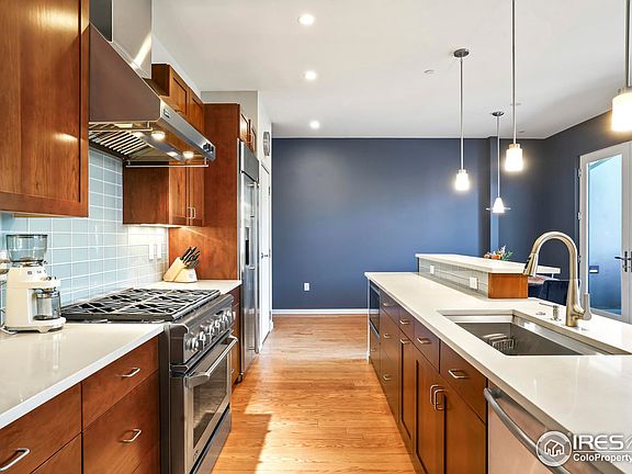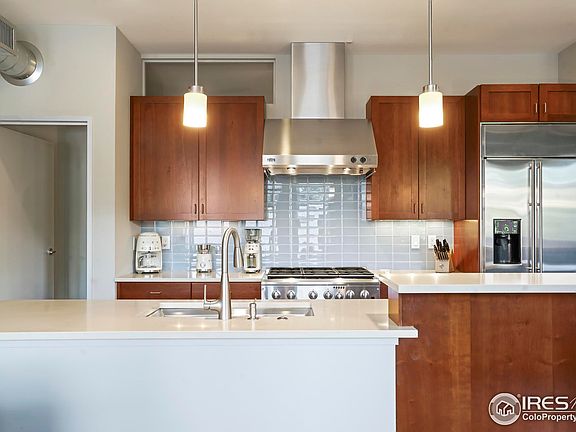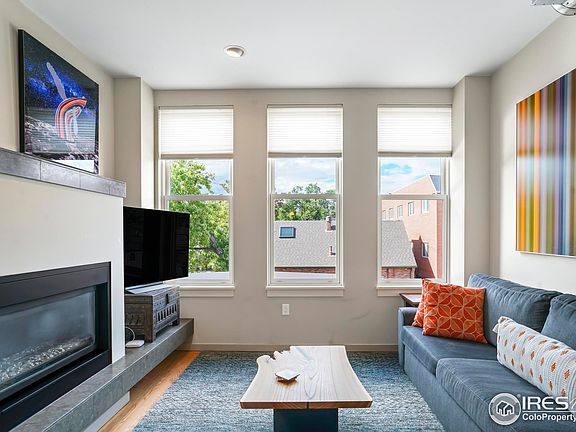 A sleek escape awaits in this Downtown Boulder residence situated just moments from Pearl Street. Located within a secured building with an elevator, this retreat flaunts modern finishes and picturesque views. An open and airy floorplan flows with beautiful hardwood flooring and stylish upgrades. Delight in crafting recipes in a sleek kitchen featuring stainless steel appliances, generous cabinetry and a stylish tiled backsplash. The living area is anchored by a fireplace, providing a cozy backdrop for relaxing evenings. Glass French doors in the dining area open to a private, covered patio offering the perfect setting for intimate outdoor dining. The primary suite boasts a walk-in closet and a serene bath with a double vanity. A secondary bedroom and a powder bath afford plenty of space for guests. Secured, underground parking is an added amenity. Residents enjoy unparalleled access to Pearl Street restaurants, shopping and entertainment plus proximity to nature trails and Boulder amenities.