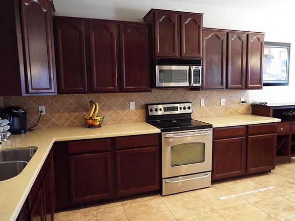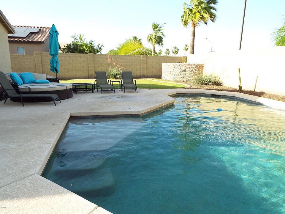 MUST SEE! Immaculate 4 bedroom, 2 bath, turn key home on spacious Corner lot! Large Master Bedroom, with private entrance to patio. Separate Tub/Shower in Master Bath with double sinks. Guest Bathroom features double sinks. Upgrades galore, plantation shutters, blinds, ceiling fans, light fixtures, beautiful floors, including Wood look tile, and new carpet in bedrooms. Kitchen has staggered cabinets, Stainless Steel/Black combo range and Microwave, upgraded countertops. Enjoy relaxing in the Pebble Tech pool, which boasts a waterfall feature, amidst a beautifully landscaped yard. Brand new Pool Pump in 2016, with 5 year warranty. Covered Patio, with cool decking that extends from the house to the pool. Outside of home painted in 2016.