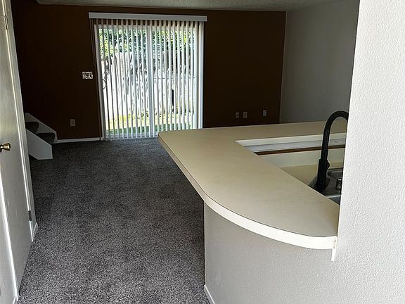 New paint, new carpet, new electric stove. Hook up for stackable washer/dryer unit on main floor. Two bedrooms and a full bath on second floor. Parking is just outside of front door marked with address. Additional visitor parking marked visitor. Small concrete pad off sliding glass door of living room for outdoor living.