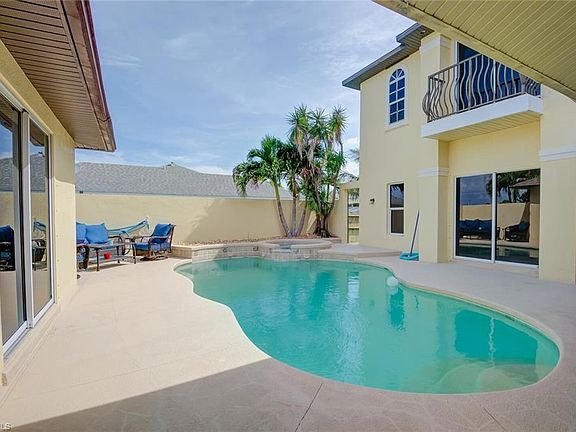 This highly sought after courtyard style pool home is priced to sell! Unique 3 bedroom+den 3 bath home features a custom pool & spa located between the main house and the guest suite. Stand on your master suite balcony overlooking the beautiful courtyard and sparkling pool. Master suite includes a large walk in closet, soaking tub and shower with dual sinks. On the 1st floor you have a 2nd bedroom, large flex room , welcoming family room with custom built ins, tray ceiling and separate dining area. The 1 bedroom and full bath guest suite is perfect for company, office or work out area. This home offers over 2360 square feet of living area, plenty of space to get some Florida sun! Need to get out of the sun and work in the garage? The 2 car garage is air conditioned with plenty of storage space. Your own personal oasis in beautiful SW Cape Coral features a large backyard and storage shed. Don't miss the opportunity to make this home yours! One year home warranty included!
