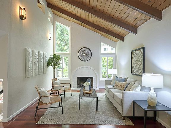 Remarkable END unit w/ private gated front entry. At once, feel welcomed by warm hardwood, vaulted wood ceilings & beautifully sunlit rooms. Completely refreshed for its new owner. Tri-level w/the formal living space on middle floor w/vaulted wood ceilings & cozy fireplace; Downstairs (no steps to entry from garage) is an updated kitchen featuring new quartz counters, new back-splash, new hardware, sink, faucet and stove; along with updated recessed lighting, a half bath & inside laundry. The kitchen opens to the dining area, a family room & another space-an office or play area! The large back patio is private & ideal for relaxing or entertaining. Upstairs is the large primary suite w/vaulted ceilings, walk-in-closet & spacious bath; Large hall bath, 2 more bedrooms, tons of closet space & an upstairs balcony. Other features include: 2 car garage, new interior paint & fixtures throughout. Community pool & tennis courts; Minutes to downtown, Heather Farms Park, Golf, Fwy access & Bart