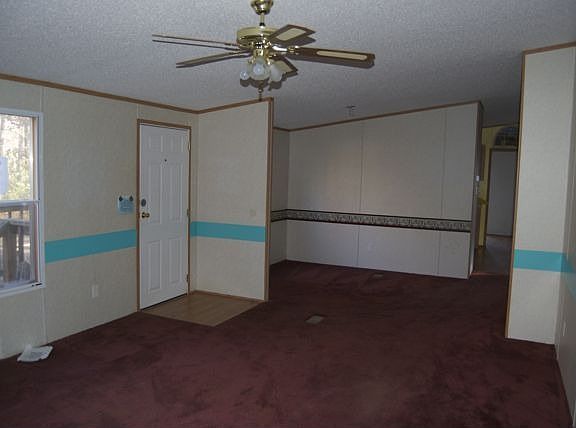 Exterior Features: The exterior of the (double wide) home is gray vinyl siding, it appears in great condition, other then small hole on side entrance. Both entrances have wooden decks attached and appear in good condition. The roof is shingled and appears in good condition. The foundation appears stable and air condition is mounted on side entrance to house. Looks in working condition. Lot is irregular shaped and has small gravel parking space for two vehicles. Interior Features: The interior of the home is as follows: Living room/ dining room: all walls appear in good shape, carpet in good condition, ceiling fan present in living room but fixture missing in dining room. Kitchen: cabinets appear in very good condition, dishwasher present, sink and faucet look good. Flooring is laminate, and appears like new. Missing fixture in this room as well. Family Room: Dark blue carpet in excellent condition, fireplace in corner, looks to be in working order. Master Bedroom: carpet is burgundy and looks good, closet missing handle. Master bath has tub, and sink, toilet is missing. Light fixtures missing in master bath. Bedroom 2: Pink walls/burgundy carpet. Walls have paint peeling. Bedroom 3: burgundy carpet, walls have some spots where wallpaper is bubbling. Main Bathroom: all appears intact, vinyl floors. Laundry Room: Vinyl floors, water heater present, furnace present, electrical panel intact. Washer and dryer hook ups intact. Side door from laundry room has some small trim damage.