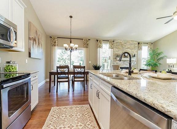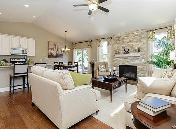 Brand New, free standing, low maintenance villa by Payne Family Homes in The Chateaux at Ohmes Farm! The Sinclair is a 2 bedroom (plus a Den), 2 bath, ranch with 1,615 square feet of one-level living. Features include a stunning brick and stone elevation, 9 foot ceilings, vaulted ceilings in the Kitchen-Café-Great Room, gas fireplace with stacked stone façade to the ceiling, upgraded 42 inch cabinets with crown molding, GRANITE COUNTERTOPS, stainless steel appliances, wood floors in the Foyer-Great Room-Hall-Kitchen-Café, oil rubbed bronze lighting and door hardware, ceiling fans, raised height vanities in the Master Bath, walk in closet, marble shower, open stairs to the lower level, main floor laundry, a 10 X 12 composite deck and more. The Flex Room-Den offers a generous sized room to use as you choose. The yard is fully sodded, sits on a cul-de-sac, has professional landscape, an irrigation system and an exposed aggregate driveway. A low monthly fee covers lawn, landscape, irrigation and some exterior maintenance (per C & R's). Fantastic location near the shopping, restaurants and recreation on Mid Rivers Mall Drive.