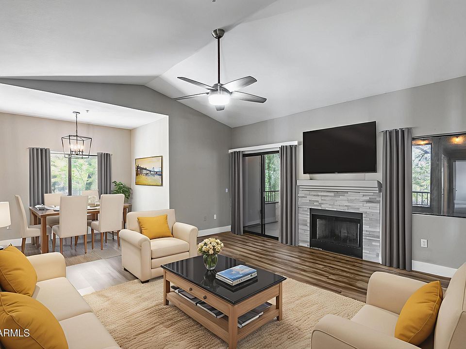Comfortable & Contemporary! This updated condo located in a gated community offers comfort & style with two spacious bedrooms, a flexible office/den & a bright Arizona room with an attached storage closet! The kitchen features white cabinets, quartz countertops, stainless steel appliances, a pantry & stacked indoor laundry. The open living area includes vaulted ceilings filled with natural light, a center fireplace & dining area. The primary suite offers patio access, a walk-in closet & an updated ensuite with a double vanity & plenty of counter space. Matching cabinets, counters & hardware throughout with added ceiling fans for comfort. Enjoy three pools, tennis courts, walking paths & gated access, all just minutes from Loop 101, shopping, dining, schools, recreation & more!