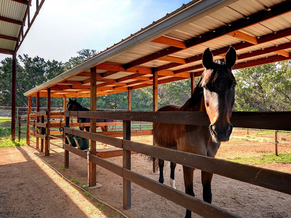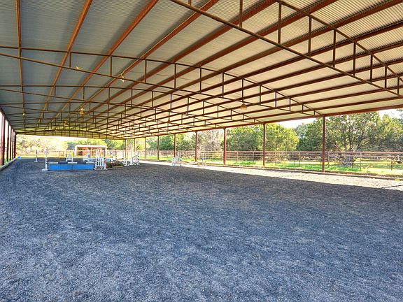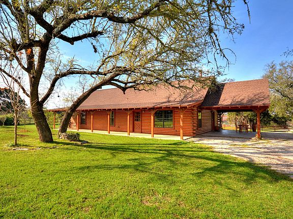 A horse lover's dream approximately 30 minutes from Austin! 11.33 acer gated equestrian facility. Huge covered arena (apx 200' X 60'), 4 barns (total of 14 stalls), 2 covered open pens, 2 covered pasture stalls, and perimeter fencing (5' pipe/non-climb wire). Charming updated log cabin with wood floors and high ceilings.Kitchen with granite and stainless. Myriad of fruit trees . Sparkling inground pool.