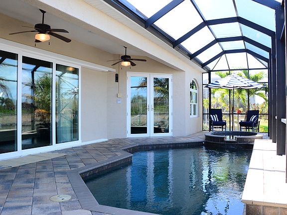 Exceptionally impressive waterfront retreat is complete with everything to enhance your lifestyle; including a heated saltwater pool & spa, 70' x 8' composite dock with 10k Cuda Gear lift & concrete seawall. This custom-built residence is highlighted with extensive finishes throughout such as Brazilian Cherry Walnut wood flooring, custom cabinetry in all bedroom walk-in closets, coffered & tray ceilings, crown molding & plantation shutters. Chefs delight gourmet kitchen is highlighted by a professional grade Thermador appliance package which includes a gas stove with built in griddle & grill, convection oven with warming drawer, heat lamps & commercial grade hood. Custom cabinetry with built in wine & spice racks, pull outs & a spacious walk in pantry are added bonuses. Enjoy the ambiance of the gas fireplace while relaxing or entertaining in your main living areas. Study/office with built in desk area offers the convenience of working from home. Elegant iron & wood staircase will lead you upstairs to the media/bonus room offering its own beverage center & private full bath. Outdoor lanai features a cabana bath, storage closet & an additional extended open paver patio leading to your boat dock, with sailboat access/no fixed bridges, where you can cruise to the Gulf of Mexico & take in captivating sunsets.