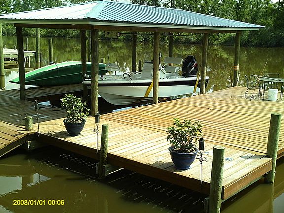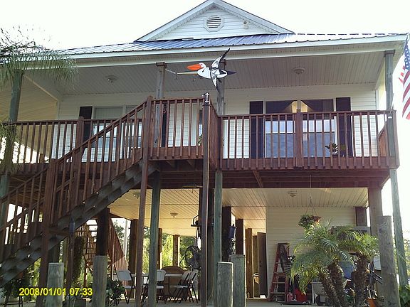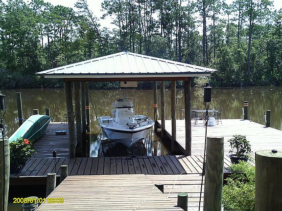 Beautiful 3bd/2ba home on the Jourdan River. 1848 sq. ft. under roof, 1400 sq. ft. living and storage, 484 sq. ft.covered porches. Boathouse w/ electric hoist, deck and bulkhead. Lifetime metal roof, vinyl siding, 12 in. treated pilings, porches treated and stained, under house full cement. Large cement driveway w/ off street parking. Decks measure 16x35 & 6x35. Central air and heat, ceiling fans, custom cabinets and vanities. Stainless steel appliances.