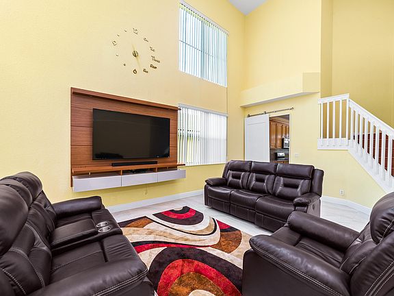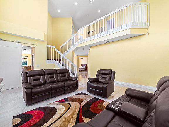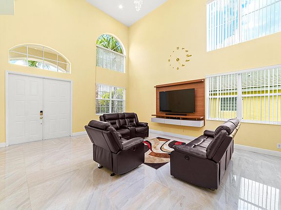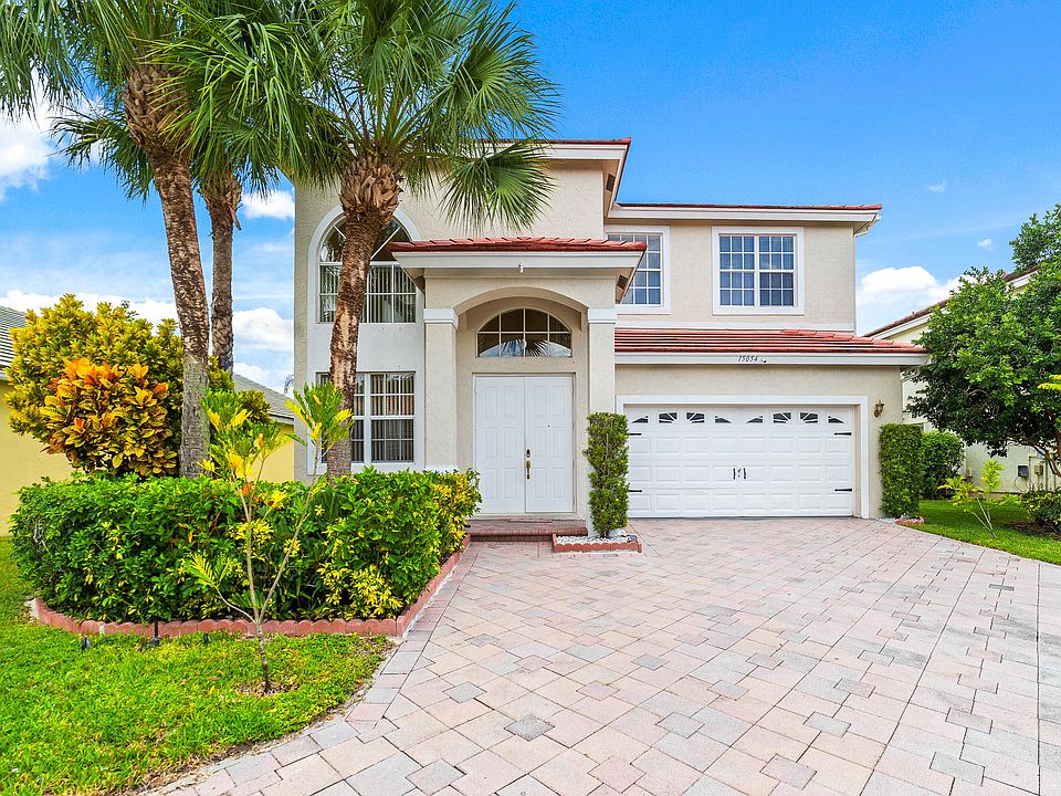 A perfect blend of indoor and outdoor living awaits you in this spacious 4-bedroom, 3-bathroom, two-story pool home, complete with a 2-car garage and very low HOA fees. Nestled on a private, 0.16-acre, fenced-in waterfront lot within an A-rated school zone, this home offers both tranquility and convenience. Many equestrian venues are just minutes away, allowing you to enjoy the world-renowned International Polo Club and exclusive horse show events in Wellington. Inside, you'll be greeted by volume 30-foot ceilings, recessed lighting, a stunning crystal chandelier in the foyer, and abundant windows that create an airy and bright atmosphere. The ground level features polished 36-inch neutral porcelain tile, while laminate flooring spans the upper floor. The well-appointed kitchen is designed for both function and style, with stainless steel appliances, granite countertops, raised cabinets with crown molding, and a charming breakfast area. The primary bedroom features a private balcony, offering a peaceful retreat with beautiful views of the backyard and beyond. Beneath the balcony, a retractable screen provides protection from bugs, ensuring that you can comfortably enjoy outdoor living. Outside, a brand-new, custom-built heated saltwater pool and a luxurious massage spa with water jets provide the ultimate relaxation experience. The serene pool area overlooks the private, fenced backyard, which is adorned with a variety of fruit trees, including mangos, coconut, papaya, avocado, and soursop. This lush oasis makes for a perfect space to entertain, unwind, or enjoy fresh fruit straight from your garden. Don't miss the opportunity to live in this exceptional home that seamlessly combines luxurious indoor spaces with stunning outdoor amenities.