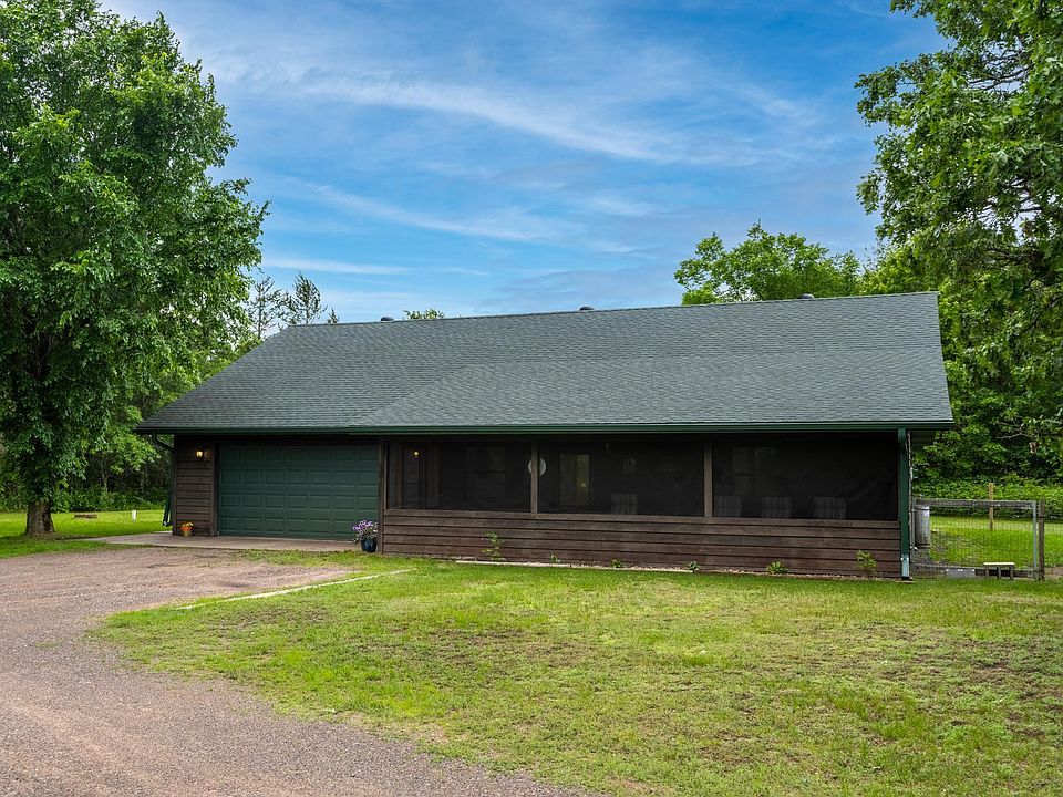 3.8 miles of paved road to Highway 87- provides easy access to Grantsburg or St. Croix Falls. There are 5 wooded acres to call your own- Featuring 3 bedrooms and 2 baths and attached garage- all on one level. updates and upgrades include: New roof in 2022, new boiler in 2021, new Anderson windows in 2017, new well in 2013, new gutters in 2023, new air to air exchanger and flooring in 2018. Nice master bedroom, with private bath, a fireplace and two walk in or step in closets, the living room has a cosey fireplace for winter nights, the 30 foot long screened porch provides a spacious place for morning coffee or a place to relax and catch up with loved ones. And a kenneled area for you pets. Lovely and easy care you will enjoy the yard space with big trees, a place for family marshmallow roasts -all with nature surrounding you. Call today and you too can enjoy the Wisconsin country lifestyle