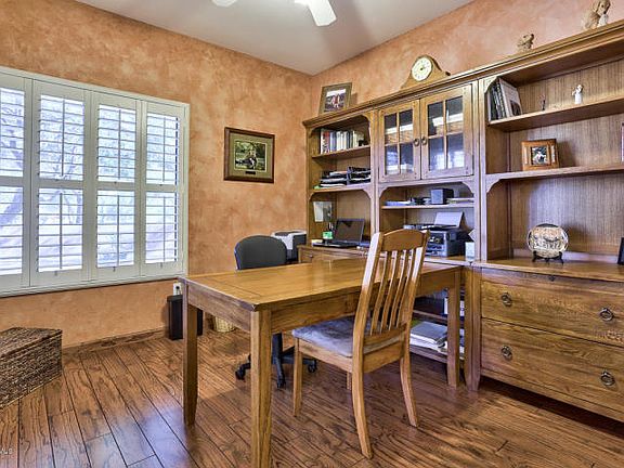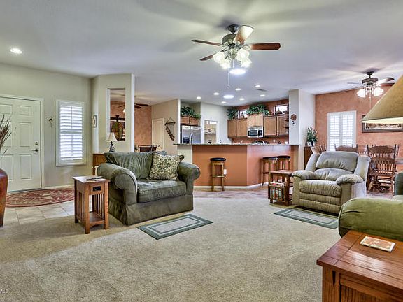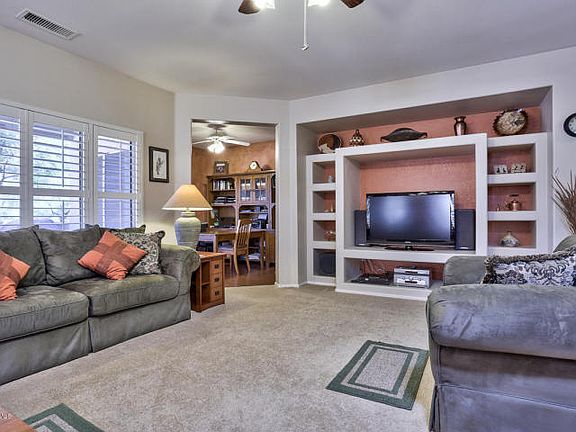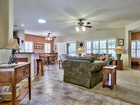 Verde(Desert Rose)with stunning kitchen and lush landscape views of the East facing patio. Flagstone courtyard entry leads you into a home with the following features; Security doors, neutral carpet & tile, raised panel doors, media wall, shutters, kitchen island, granite c-tops, dark oak cabinets, SS appliances, new dishwasher, new garbage disposal, master suite w/dual sinks, ceiling fans, 2 solar tubes, sun screens,extended patio with wall,rain gutters, PVC irrigation system are just some of the up grades in this home. One Guard Home Warranty offered. Furniture available outside of escrow. A must see home!