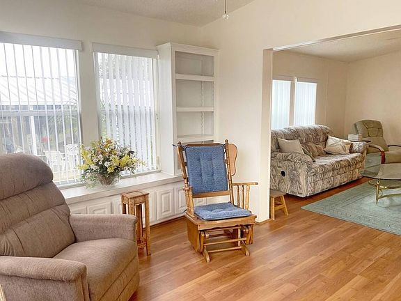 Beautiful...Light...Airy...Move-In Ready!.................... Homes in Four Lakes Golf & Country Club, a 55+ community, are on lot leased land. Owning the home, but not the land, you pay a monthly lot rent of $580 which gives you and your guest access to the amenities of the community..................... When you enter through the Florida sunroom and see the clean colors and natural light highlighting tastefully built in shelves and cabinets you will start to fall in love with this 2-bedroom, 2-bath home. The home feels spacious, light and airy, but storage abounds!.................... The dining area has a built-in breakfront with glass doors to display your favorite items. There is one linen closet in the hall and another in the main bath..................... The updated kitchen sports newer appliances and lots of cupboard space, including a pantry and a breakfast bar. The bay windows over the sink give you a panoramic outside view to enjoy while you are baking cookies or washing dishes..................... The two bedrooms are both a comfortable size with large closets. The main bedroom can easily house a king bed and the room will still feel spacious..................... The separate inside laundry room is a great feature and leads you to a large ground level screen room (12âEUR² x 12âEUR²)...a great place for relaxation and entertainment..................... The 12'x20âEUR² oversize shed can house a golf cart and more..................... Four Lakes Golf Club is an affordable, award-winning retirement community. It carries on that tradition with only the finest homes, amenities and service that is second to none. Anyone looking for an active retirement community in the central Florida area need look no further................... Amenities include: 22,000 sq. ft. full service clubhouse; Four beautiful lakes with marina; Large heated swimming pool; Master whirlpool spa; 18 hole regulation golf course; Billiard and game room; Library & surround sound theater; 24 hour gated security; Exercise room with sauna; Fully equipped crafts room w/ kilns; Putting greens and pro-shop; and Access control gate with attendant. Pets under 40 lbs. allowed.