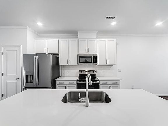 The kitchen features crisp white cabinetry, quartz countertops, tile backsplash, stainless steel appliances, and a large island flowing seamlessly into the living and dining area. You'll also love the 9-foot ceilings and durable luxury vinyl plank flooring on the main level. Each bedroom has its own private bath for extra comfort and privacy, and a flexible third-floor loft makes a great home office, media room, or workout space.
